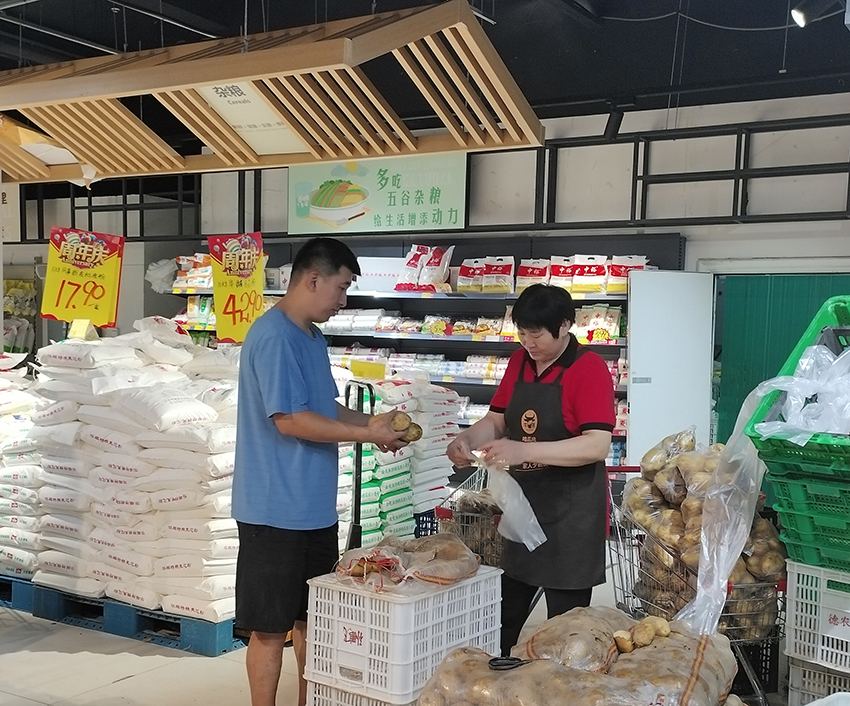 店慶期間,高新店同事們為方便顧客按需購買、減少排隊時間,利用中午休息時間提前將土豆分級裝袋。